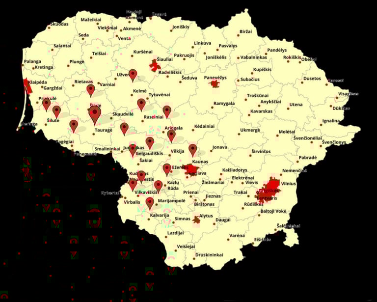 Jurbarkas, Smalininkai, Skirsnemunė, Eržvilkas, Raudonė, Viešvilė, Veliuona, Seredžius, Šimkaičiai, Vadžgirys, Girdžiai, Stakiai, Jurbarkai, Kiduliai, Plokščiai, Sudargas, Slavikai, Sintautai, Lukšiai, Gelgaudiškis, Tauragė, Gaurė, Batakiai, Žygaičiai, Skaudvilė, Adakavas, Šakiai, Pagramantis, Lauksargiai, Šilutė, Žemaičių Naumiestis, Usėnai, Katyčiai, Kintai, Šilalė, Pajūris, Kvėdarna, Bijotai, Laukuva, Upynė, Kryžkalnis, Raseiniai, Ariogala, Betygala, Vilkija, Zapyškis...